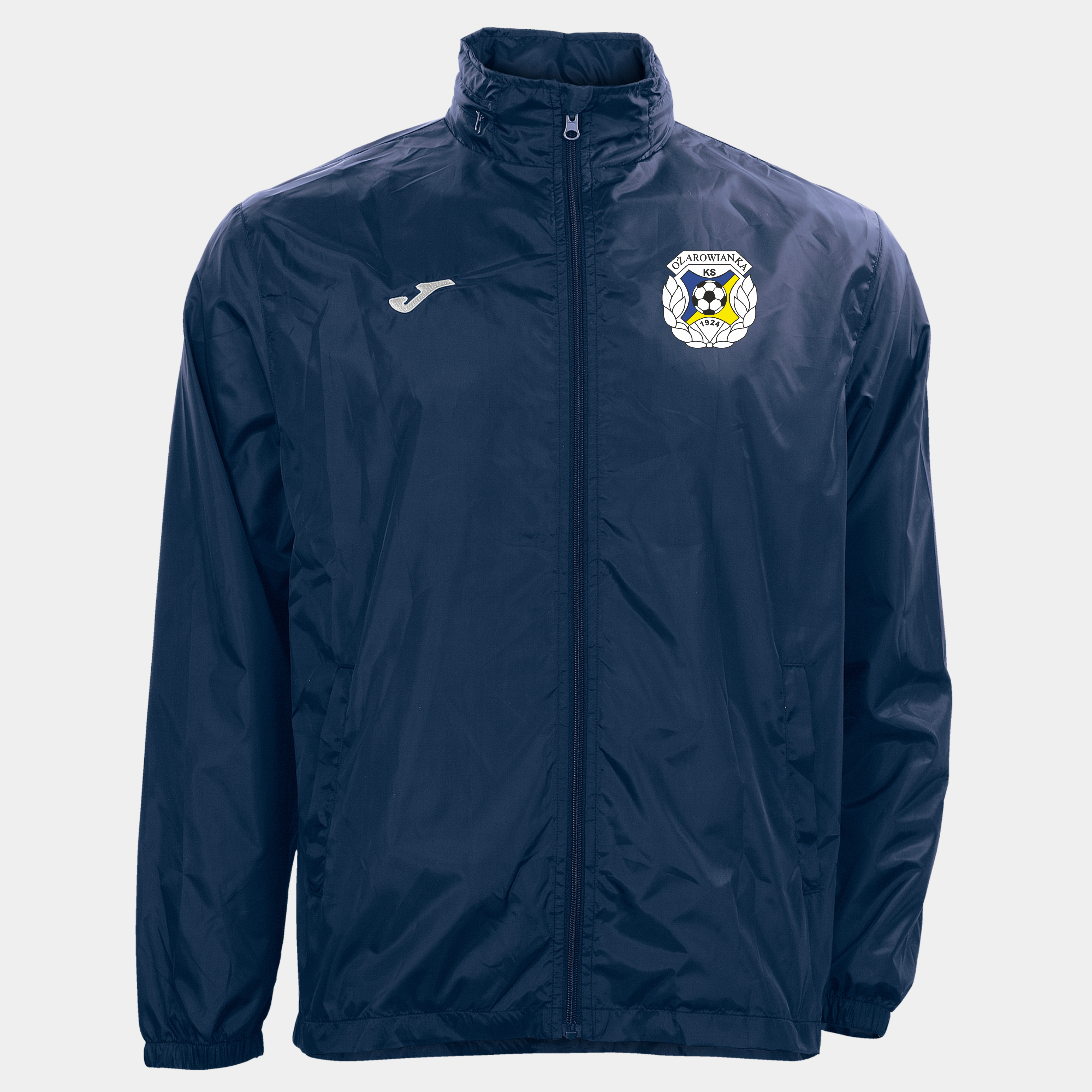 Ortalion akademii KS OŻAROWIANKA z herbem żakardowym (przyszywanym). Kurtka przeciwdeszczowa. Zapinana na suwak z kieszeniami oraz kapturem.